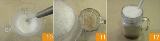 Deixe o leite esfriar ligeiramente, depois bata por alguns segundos com o espumador de leite até obter uma espuma 10. Encha a jarra com o leite e a espuma 11 e saboreie seu iced ginseng com caramelo 12!