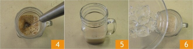Bata ligeiramente o líquido com o espumador de leite 4. Deixe esfriar por alguns minutos 5, depois adicione alguns cubos de gelo 6.