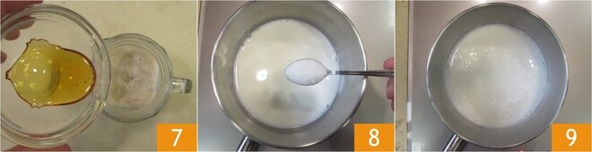Adicione também o caramelo 7. Enquanto isso, despeje o leite em uma panela, adicione 2 colheres de chá de açúcar 8 e deixe derreter no fogo 9.