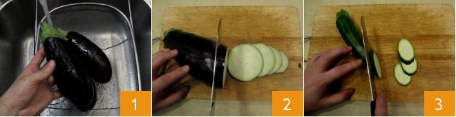 Para preparar a salada com scamorza e Legumes grelhados, lave todos os legumes em água corrente abundante e fresca 1 e seque-os. Corte as abobrinhas e as berinjelas em rodelas com espessura de 4-5 mm (2-3);