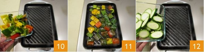 Quando a grelha estiver bem quente, cozinhe os legumes aos poucos: distribua os pedaços de pimentão um ao lado do outro 10, grelhando-os por 5 minutos e virando-os com uma pinça de cozinha para uma cocção uniforme 11, depois coloque no fogo as rodelas de abobrinha 12