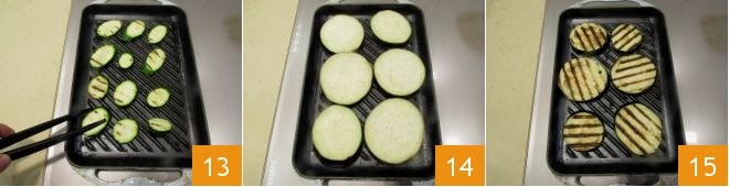 por 3 minutos 13 e continue com as berinjelas por mais 3 minutos (14-15). Lembre-se de sempre virar o legume para uma cocção homogênea.