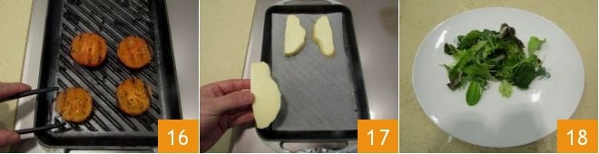 Finalmente, termine com os tomates, cozinhando-os por 4 minutos até que estejam bem grelhados 16. Corte uma folha de papel manteiga do tamanho da grelha e coloque-a para proceder com o cozimento da scamorza. Distribua as fatias e grelhe-as por alguns segundos 17. Neste ponto, distribua a salada mista em um prato de servir 18 junto com os legumes;