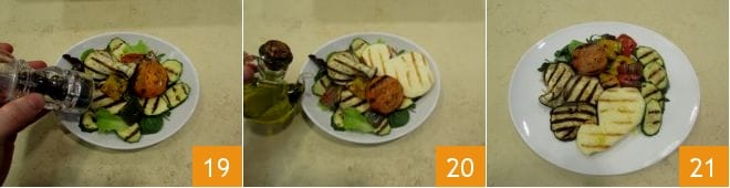 ajuste o sal e a pimenta 19 e tempere com o azeite de oliva. Finalmente, você pode servir e desfrutar de sua salada com scamorza e legumes grelhados 21.