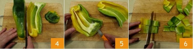 pegue os pimentões, elimine a parte superior, divida-os ao meio 4, em seguida, com uma faca, retire os filamentos brancos e as sementes que estão dentro 5. Corte-os em fatias, depois em cubos bastante grandes e reserve 6.