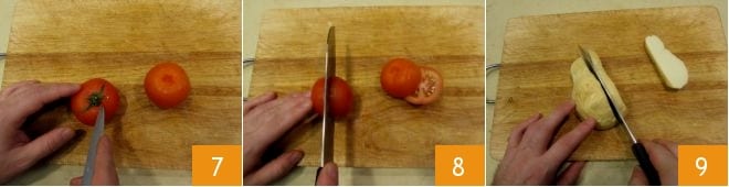Retire o pedúnculo dos tomates 7 e corte-os em rodelas ainda de 4-5 mm 8. Corte a scamorza em fatias no sentido do comprimento 9, depois coloque para aquecer uma grelha no fogo.