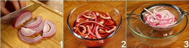 Despeje os feijões junto com a sua água de conserva em uma peneira, depois enxágue-os rapidamente em água corrente e deixe-os escorrer bem. Descasque e corte a cebola roxa de Tropea em fatias finas 1, depois coloque-a em uma tigela com um copo de vinagre de vinho, cobrindo-a com água fria; deixe de molho assim por cerca de meia hora, depois escorra 3.