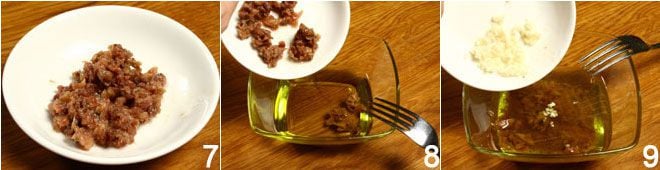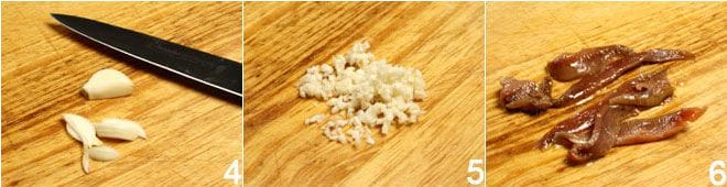 Enquanto isso, descasque o alho 4 e depois pique finamente e reserve 5. Passe para as anchovas, disponha-as sobre a tábua de corte 6