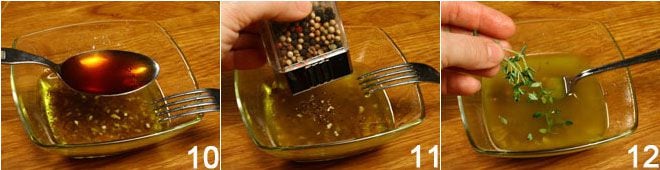 1 colher de sopa de vinagre 10, o sal e a pimenta moída 11 e as folhinhas de tomilho 12. Emulsione tudo com um garfo para incorporar os ingredientes.