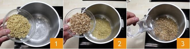 Para preparar a salada de farro e cevada de verão, comece cozinhando os cereais: coloque numa panela grande a cevada 1 e o farro perolados 2 adicione bastante água salgada até cobrir os cereais 3 e cozinhe-os seguindo as instruções da embalagem (geralmente precisam de cerca de 15-18 minutos de cozimento);
