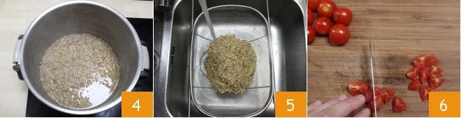Uma vez cozidos, terão absorvido parte da água 4, escorra-os e passe-os sob água corrente fria para interromper o cozimento e resfriá-los 5; transfira-os para uma tigela grande e reserve. Cuide agora dos tomates: lave-os em água corrente e corte-os em pequenos pedaços 6,