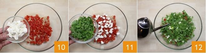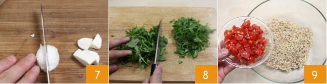 elimine a água de conservação dos bocadinhos de mussarela e corte-os em cubos 7. Limpe a rúcula e lave-a bem em água; pique grosseiramente também as folhas de rúcula 8. Neste ponto, pegue a tigela com os cereais e adicione os tomates-cereja 9,