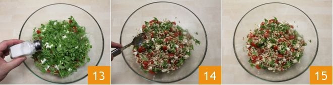 e ajuste o sal, se necessário 13. Misture com uma colher para que os cereais se insiram bem com o tempero 14. Sua salada de farro e cevada de verão está pronta para ser saboreada 15 e servida fria.