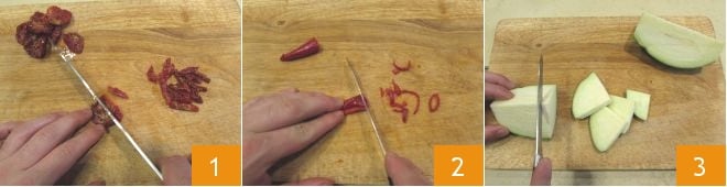 Para preparar a salada de macarrão com berinjelas e tomates secos, comece cortando os tomates secos em tiras finas 1. Retire as sementes da pimenta fresca e corte-a também em tiras muito finas 2. Corte a berinjela em 4 partes e depois cada parte em fatias de 3-4 mm 3.
