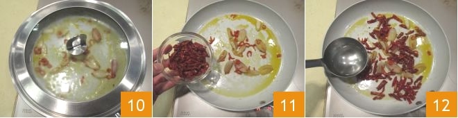 Cubra com uma tampa e deixe cozinhar por alguns minutos 10. Em seguida, adicione os tomates secos 11 e acrescente mais um pouco de água de cozimento 12.