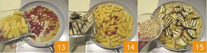 Escorra o macarrão al dente e misture ao molho na frigideira 13. Adicione também as berinjelas 14 e os pinhões tostados 15.