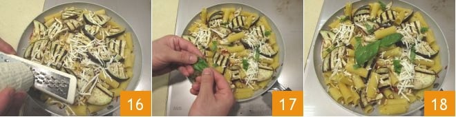 Sauté o macarrão por alguns minutos, então polvilhe com a ricota salgada ralada 16, o manjericão picado grosseiramente à mão 17 e sirva sua salada de macarrão com berinjelas e tomates secos quente ou fria conforme seu gosto 18!