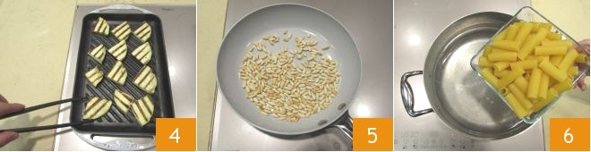 Grelhe as fatias de berinjela na grelha quente por cerca de 2 minutos de cada lado 4. Torre então os pinhões em uma frigideira antiaderente por 3-4 minutos, cuidando para não queimá-los 5. Agora coloque os rigatoni em água fervente salgada 6.