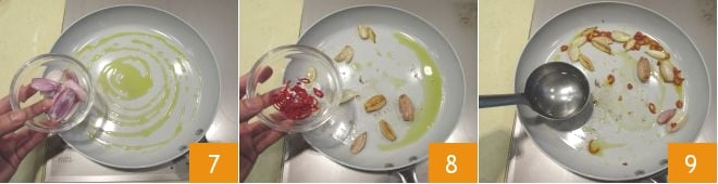 Enquanto a massa cozinha, refogue a cebola picada grosseiramente em uma frigideira onde você já aqueceu o óleo em fogo alto 7, e depois adicione a pimenta 8 e acrescente uma concha da água de cozimento da massa 9.