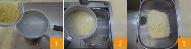 Para preparar a salada de arroz com manga e abacaxi, comece cozinhando o arroz, coloque-o em abundante água salgada e fervente e deixe-o cozinhar seguindo os tempos indicados na embalagem 1. Em seguida, escorra 2 e deixe esfriar em temperatura ambiente 3.