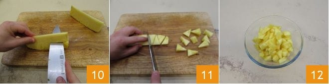 elimine a parte central 10, que é mais dura, e depois disponha as fatias na tábua de corte, desta forma conseguirá obter pequenos triângulos cortando de forma transversal 11; coloque os triângulos em um recipiente 12.