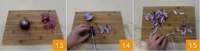 Limpe a cebola roxa 13 e corte em fatias com cerca de 1 cm de espessura 14, por fim, corte as fatias grossas obtidas dividindo-as ao meio ou em 3 partes 15.