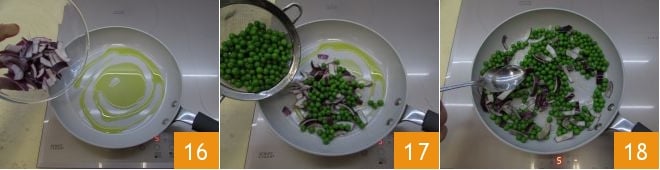 Em uma frigideira, coloque azeite de oliva extra virgem junto com as cebolas 16 e deixe fritar por um instante, depois adicione as ervilhas 17 e algumas colheres de água para prolongar o cozimento 18, será necessário cerca de dez minutos, apenas o tempo de amaciá-las um pouco. O cozimento da cebola suavizará o sabor, se preferir um sabor mais forte, não cozinhe; se utilizar ervilhas congeladas, deixe-as descongelar em água quente por cerca de dez minutos antes de cozinhar.
