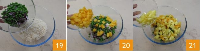 Assim que o arroz e as ervilhas estiverem bem frios, misture-os 19, depois adicione os cubos de manga 20 e os triângulos de abacaxi 21,