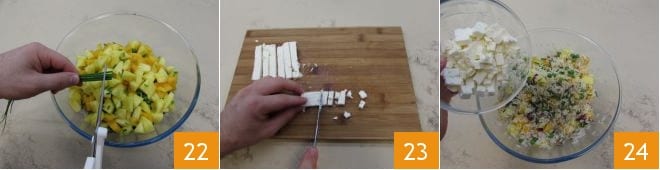 corte com a tesoura um pouco de cebolinha 22. Por fim, corte também o queijo feta em cubos 23 e adicione à salada de arroz junto com uma pitada de pimenta-do-reino moída 24.