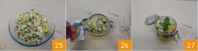 Misture bem todos os ingredientes 25 e se quiser uma forma original de servir, coloque a salada de arroz em potes de vidro, você obterá 6 usando aqueles com capacidade de 350-400 ml 26 e por fim coloque na geladeira decorando com um pouco de hortelã fresca para cada pote 27. Depois de algumas horas na geladeira, sua salada de arroz com manga e abacaxi estará pronta para saborear!