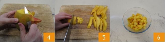 Enquanto isso, cuide das frutas, descasque a manga 4, depois corte em tiras e finalmente em cubos de cerca de 1 centímetro 5, recolha e reserve em um recipiente 6.