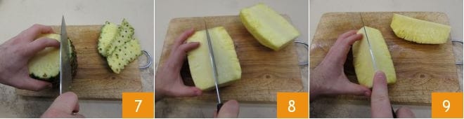 Passe a limpar o abacaxi: elimine as duas extremidades do abacaxi e depois elimine a casca e eventuais resíduos 7. Corte ao meio no sentido do comprimento obtendo duas metades 8, e continue cortando novamente ao meio, sempre no sentido do comprimento, até obter 8 partes no total 9