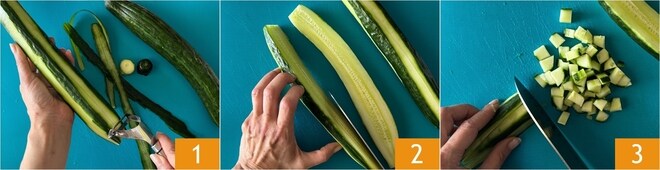 Para preparar a salada Shirazi, primeiro prepare os legumes: corte as pontas dos pepinos, depois descasque-os em tiras alternadas com um descascador 1. Divida-os ao meio no sentido do comprimento 2 e remova as sementes centrais, depois corte-os em cubos bem pequenos 3.