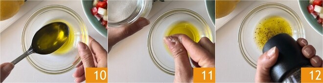 Passe para o tempero: coloque o azeite em uma tigelinha 10, adicione sal 11 e pimenta 12.