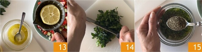 Adicione o suco de limão 13, depois pique a salsa e o manjericão 14. Adicione as ervas picadas e a menta seca 15 e emulsione tudo.