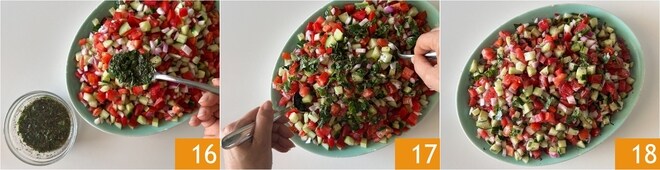 Distribua o tempero sobre a salada 16 e misture bem 17. A salada Shirazi está pronta para ser servida 18!