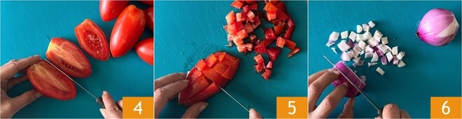 Divida os tomates ao meio também 4 e corte-os em cubos após remover as sementes 5. Limpe e corte a cebola em cubos também 6.