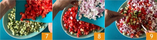 Transfira os pepinos para um prato de servir junto com os tomates 7 e as cebolas 8, depois misture bem 9.
