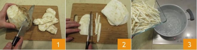 Para preparar a salada Waldorf, comece limpando o aipo-rábano. Primeiro descasque o aipo-rábano 1, lave-o bem e corte-o em julienne 2. Em seguida, escalde-o em bastante água salgada fervente 3,