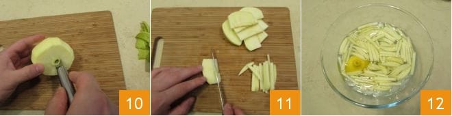 Uma vez preparado o molho, descasque a maçã, retire o miolo com o utensílio apropriado 10 e, em seguida, corte-a também em julienne 11; coloque a maçã cortada dentro de uma tigela e, para não escurecer, adicione meio limão espremendo o suco e deixando-o depois na água 12.