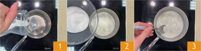 Leve para ferver 4 até que o açúcar esteja completamente dissolvido. Transfira para uma tigela 5 e deixe esfriar primeiro em temperatura ambiente e depois na geladeira por uma hora 6.