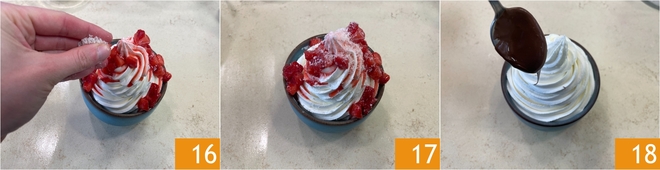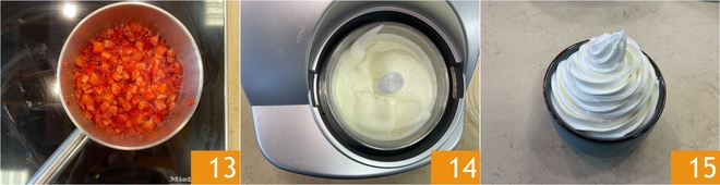 Cozinhe por alguns minutos, até que fiquem macios 13, depois transfira para uma tigela e coloque na geladeira. Quando o sorvete estiver pronto e consistente o suficiente 14, você poderá transferi-lo para as tigelinhas 15. Use uma colher ou um saco de confeitar para obter a forma típica. Nesse caso, você deve ser muito rápido porque o sorvete de iogurte pode derreter.
