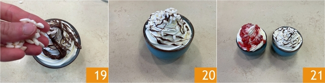 Decore com arroz tufado 19 e a segunda versão também estará pronta 20! O frozen yogurt está pronto para ser servido 21; se você não quiser degustá-lo imediatamente, coloque o sorvete no freezer e depois monte as tigelinhas na hora.
