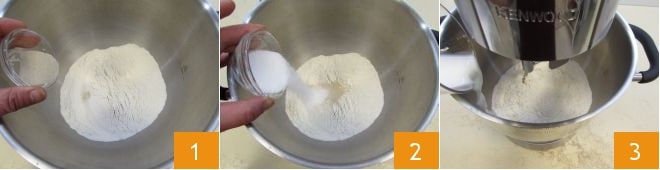 Para preparar as Iris, comece pela preparação da massa. Despeje a farinha peneirada na tigela da batedeira, juntamente com o fermento 1, depois adicione o açúcar 2, ligue a máquina em velocidade moderada com o gancho montado e comece a adicionar o leite morno lentamente 3.
