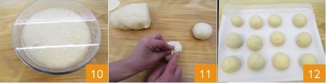 Após as 4 horas, a massa terá dobrado de volume 10, então, recupere-a e divida-a em 12 pedaços de cerca de 80 gramas cada, trabalhando-a com as mãos na superfície de trabalho em um movimento rotatório para formar bolas 11; coloque-as em uma bandeja forrada com papel manteiga 12 e deixe levedar por mais uma hora cobertas com um pano limpo.