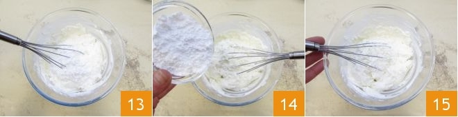 Enquanto isso, prepare o recheio das suas Iris. Peneire a ricota, adicione o açúcar de confeiteiro, e mexa delicadamente com o batedor 13; depois divida a mistura em duas tigelas. Em uma tigela, adicione a dose extra de ricota e açúcar de confeiteiro (a indicada para o recheio clássico) 14. Para a outra tigela, que será a base do recheio com gotas de chocolate, não será necessário adicionar mais nada 15.