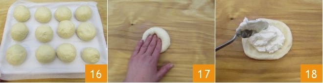 Recupere as bolinhas já levedadas 16 e com os dedos, achate-as para formar círculos 17; depois adicione uma colher cheia do recheio clássico no centro de 6 destes discos 18.