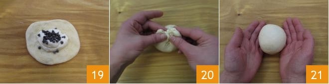 Os 6 discos restantes serão recheados com 1 colher do recheio básico e será adicionado uma colher de chá das gotas de chocolate que você teve o cuidado de congelar anteriormente 19. Prossiga fechando todos os círculos de massa, levantando as bordas e unindo-as, como se fossem trouxinhas 20. Então, vire-os e tente dar-lhes a forma de uma bola, girando-os no sentido horário na superfície de trabalho e simultaneamente fazendo uma leve pressão lateralmente com as mãos 21.