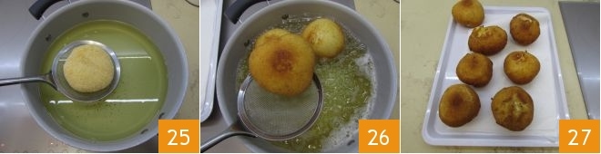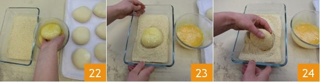 Neste ponto, passe suas Iris, delicadamente, primeiro nos ovos levemente batidos 22 e depois na farinha de rosca (23-24).
