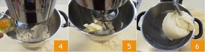Adicione também o ovo 4 e trabalhe a massa por cerca de 10 minutos, depois adicione a manteiga, em temperatura ambiente, pouco a pouco, esperando que um pedaço seja absorvido antes de prosseguir com o próximo 5, e amasse até que a mistura se solte das paredes da tigela da batedeira, aderindo ao gancho 6.